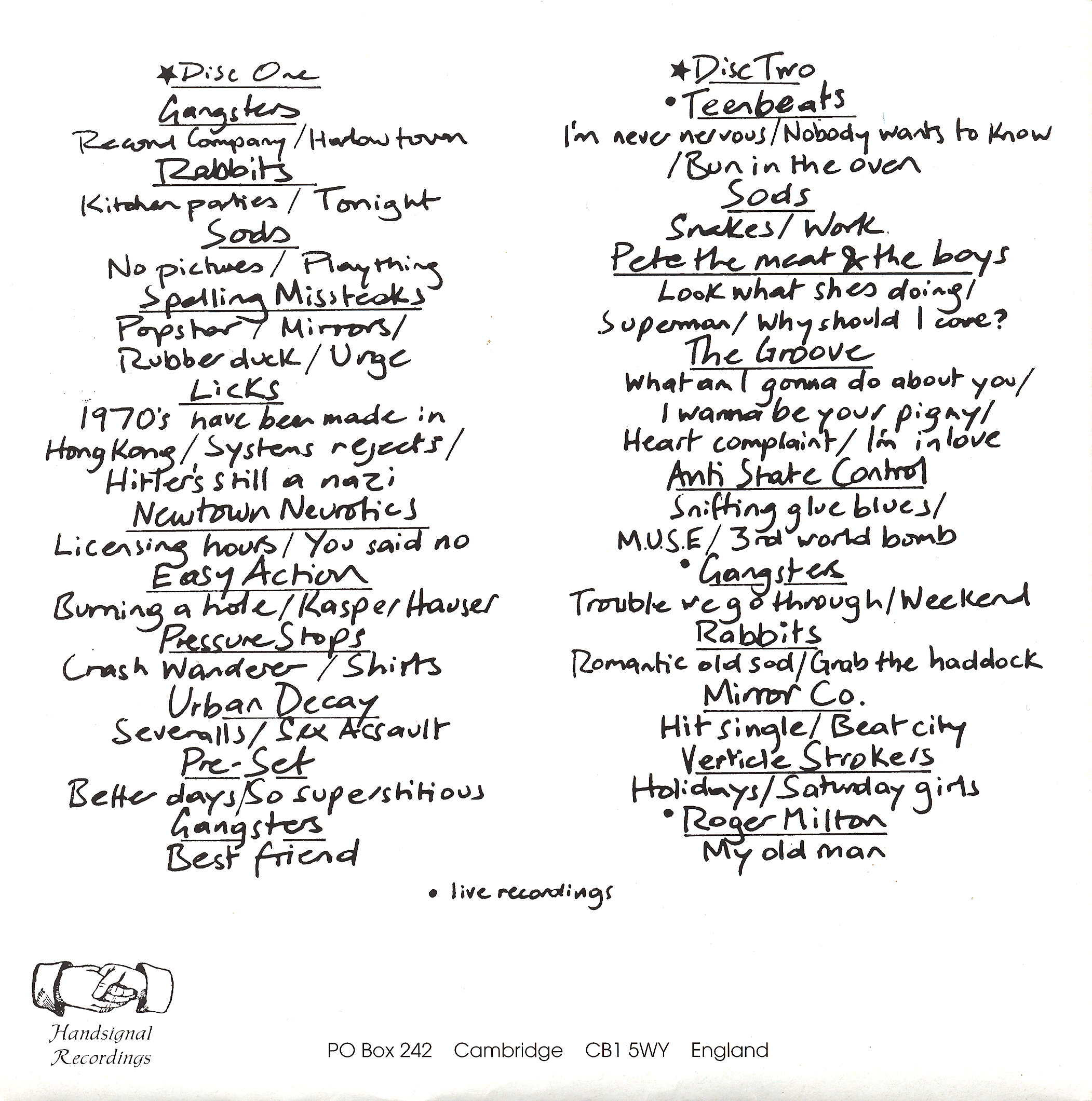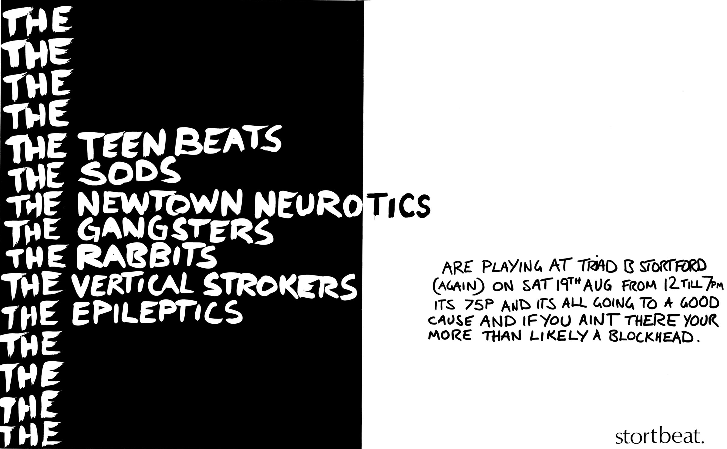 STORTBEAT - A MUSICAL COLLECTIVE In 1978 a group of individuals from local bands inspired by the DIY ethic of punk started their own record label. They were Richard Holgarth and Billy Meadows from The Gangsters, Kevin Jones and Shane Roe from The Sods with Colin Babb who did the accounts. STORTBEAT began life in 1978 with a £1000 overdraft from a bank. The first release was "Record Company"/"Harlow Town" by The Gangsters. It got good reviews and was played by John Peel on his Radio 1 show. The main venues in the area were The Triad in Stortford and The Square in Harlow. In a couple of months the initial pressing had sold out which enabled more releases to be made. The Harlow Playhouse bar on Saturdays became Stortbeats central meeting point. Gordon Wilkins and Pete Lawrence later compiled a collection of Stortbeat recordings for HandSignal records. |